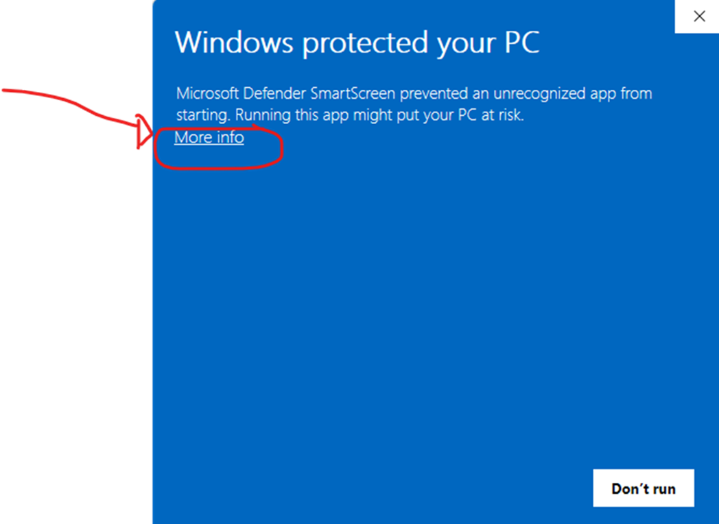 Ignore Don’t Run. Click on More Info. After selecting More Info, the option to Run anyway appears. Click on it.