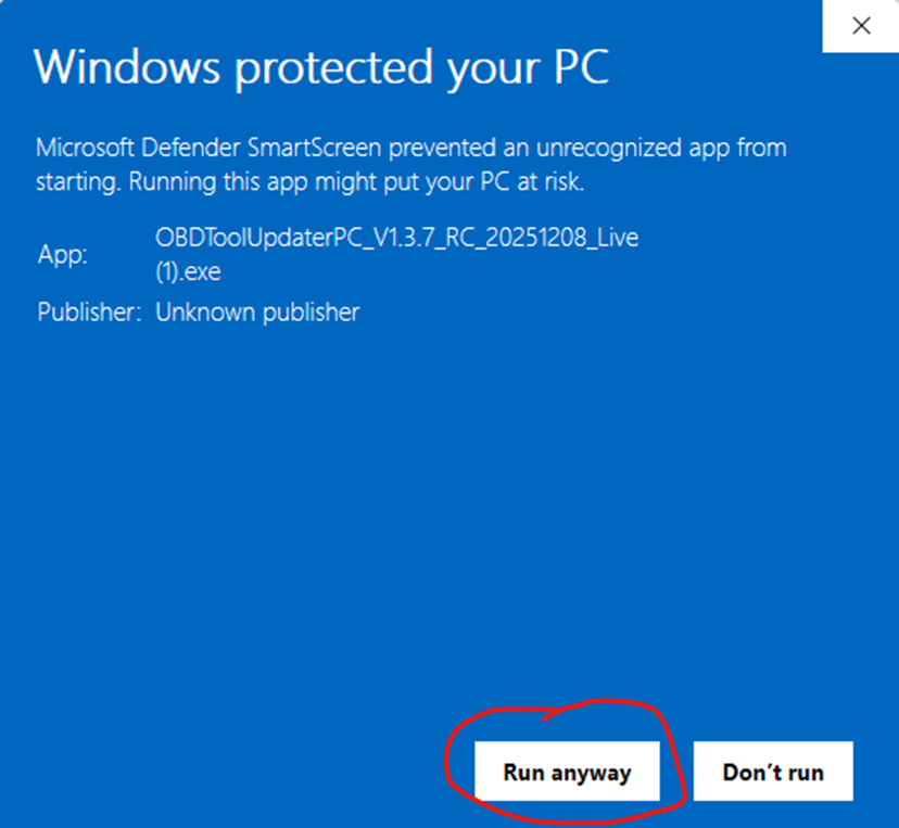 PCs will have the same issue and a similar message to Mac: Do you want this app from an unknown publisher to make changes to your device? Click Yes to proceed with installing the OBD Tool Updater on your PC. Continue to follow any instructions on your PC to complete installation successfully.