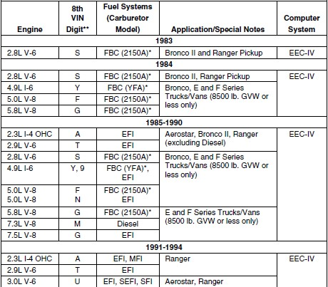 | ** VIN Number. The VIN number(s) used in this column identify the vehicle’s engine type. This number is the 8th digit of the VIN (Vehicle Identification Number). Consult your vehicle’s repair manual for details |