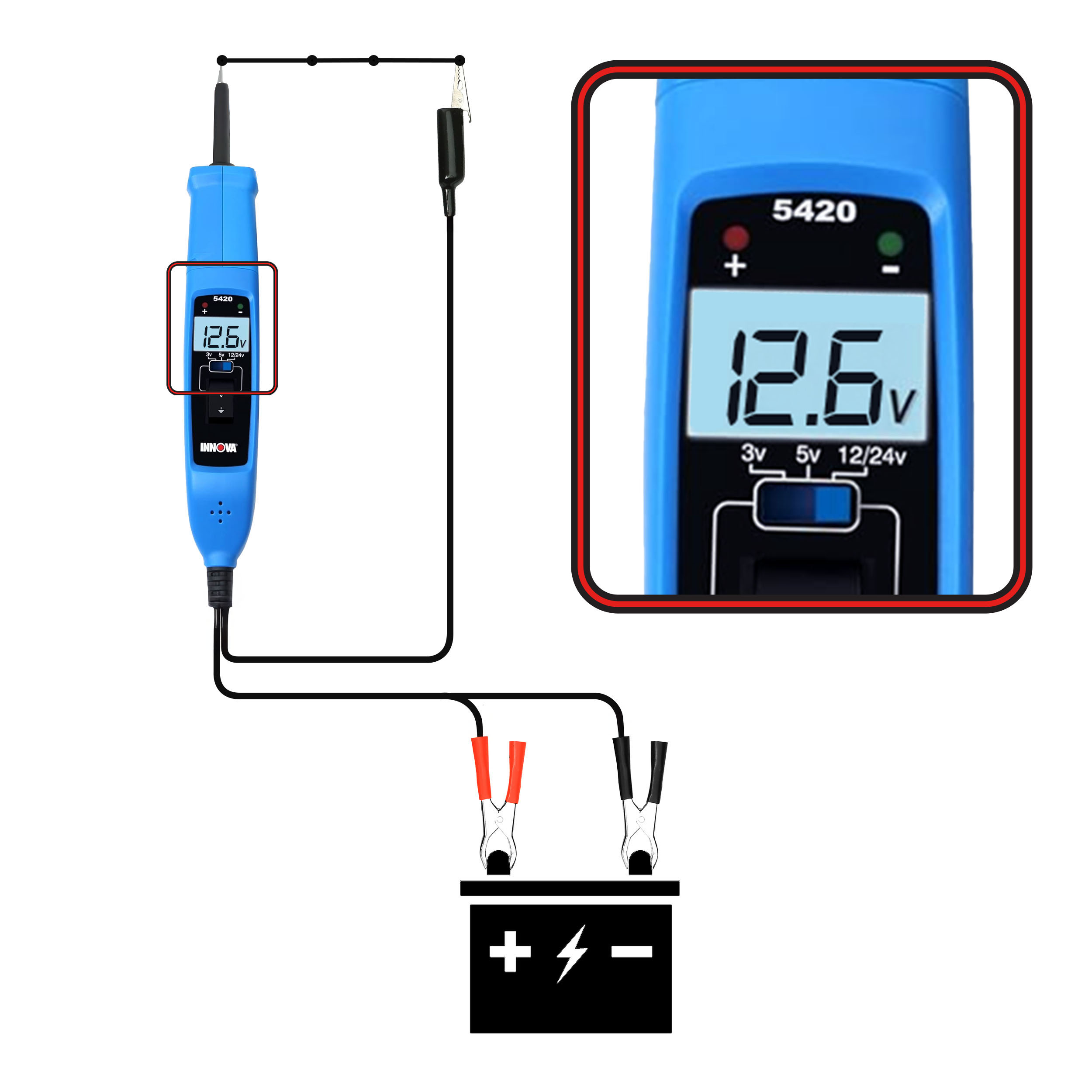 - If the probe and the continuity cable are connected, the 'LCD Display' will show to supply voltage indicating continuity. The 'Red LED' will light, and the device will produce a high-pitched beep.